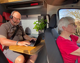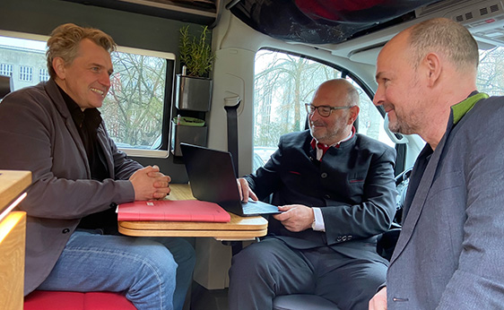 In Film-Recht-Mobil sind persönliche Besprechungen im kleinen Kreis möglich. Mit der Video-Konferenzanlage sind natürlich aus dem Van heraus von überall her Rechtsberatungen machbar.